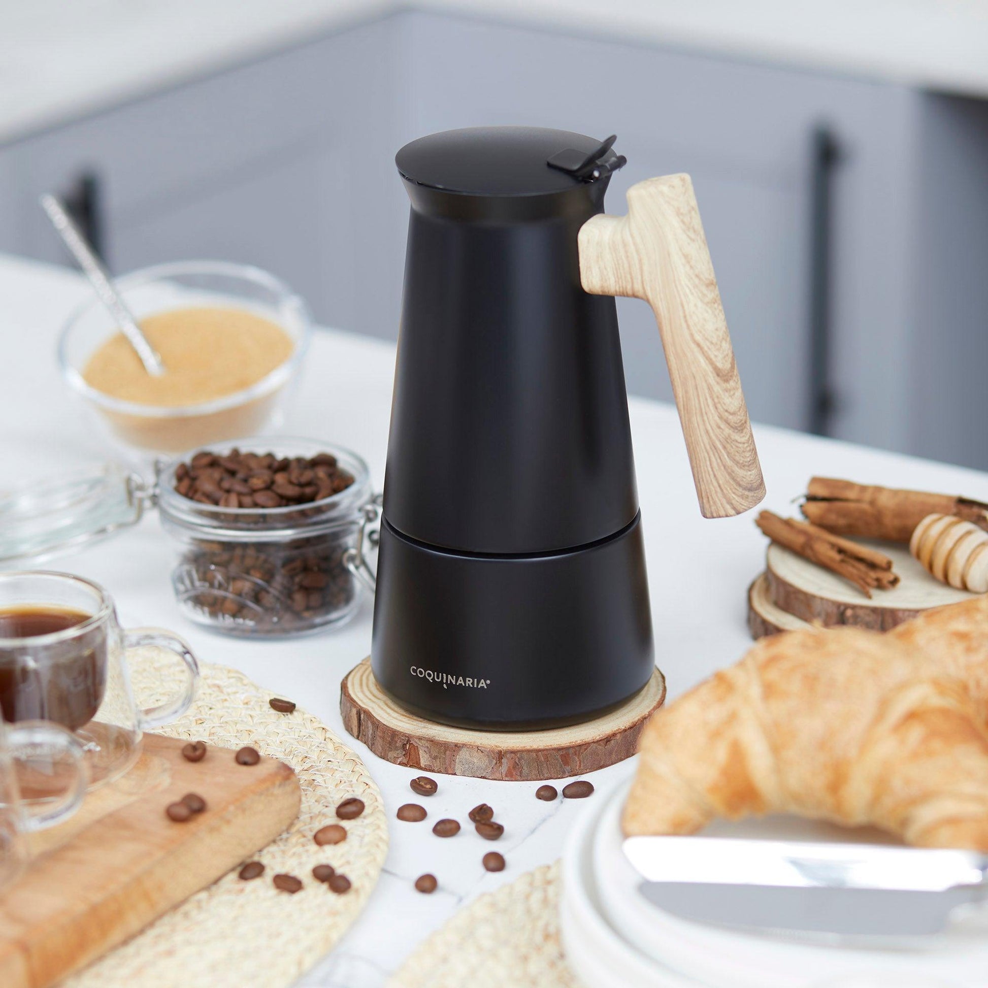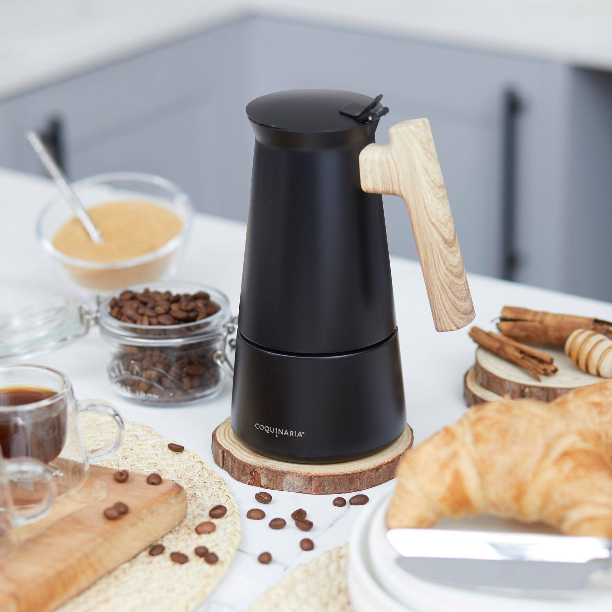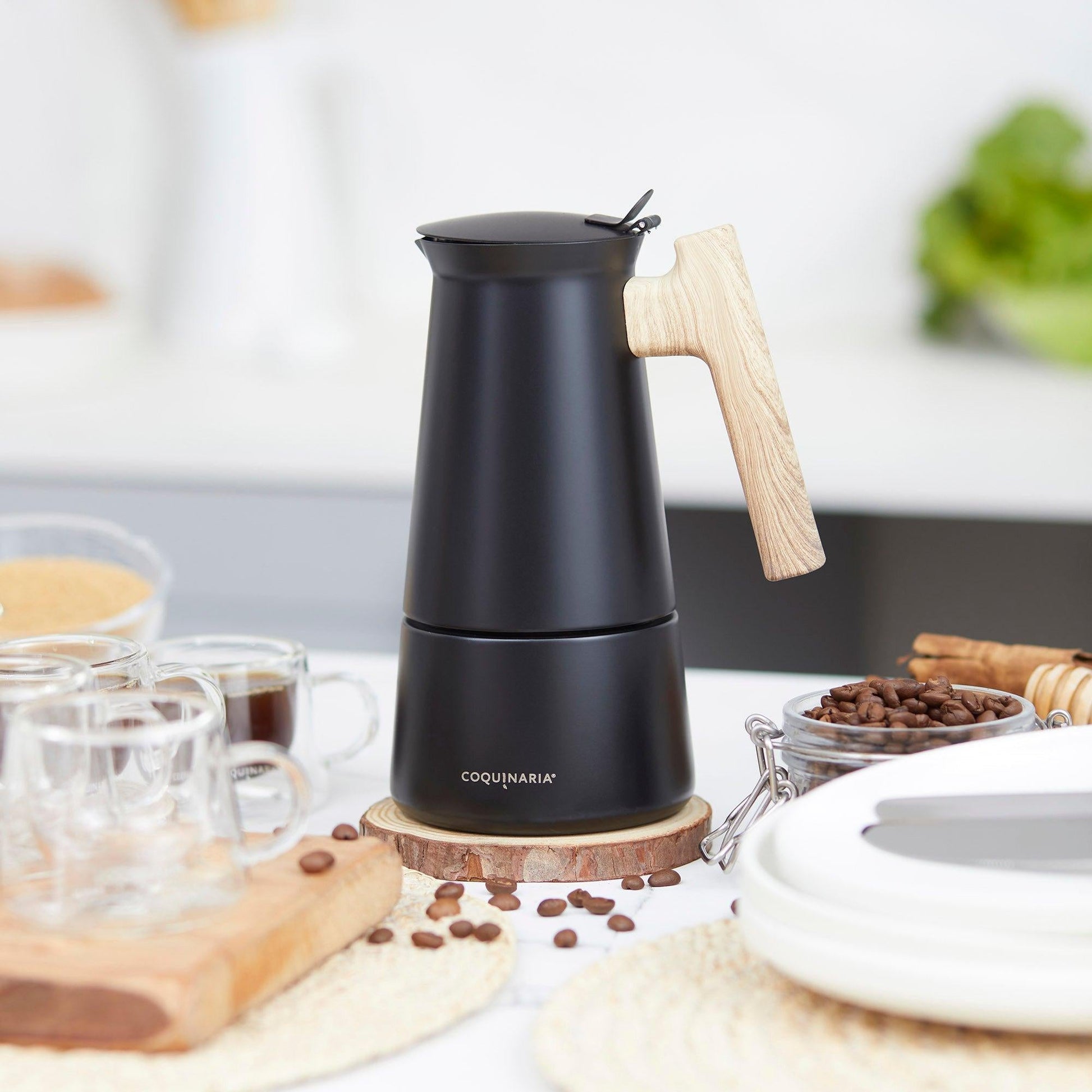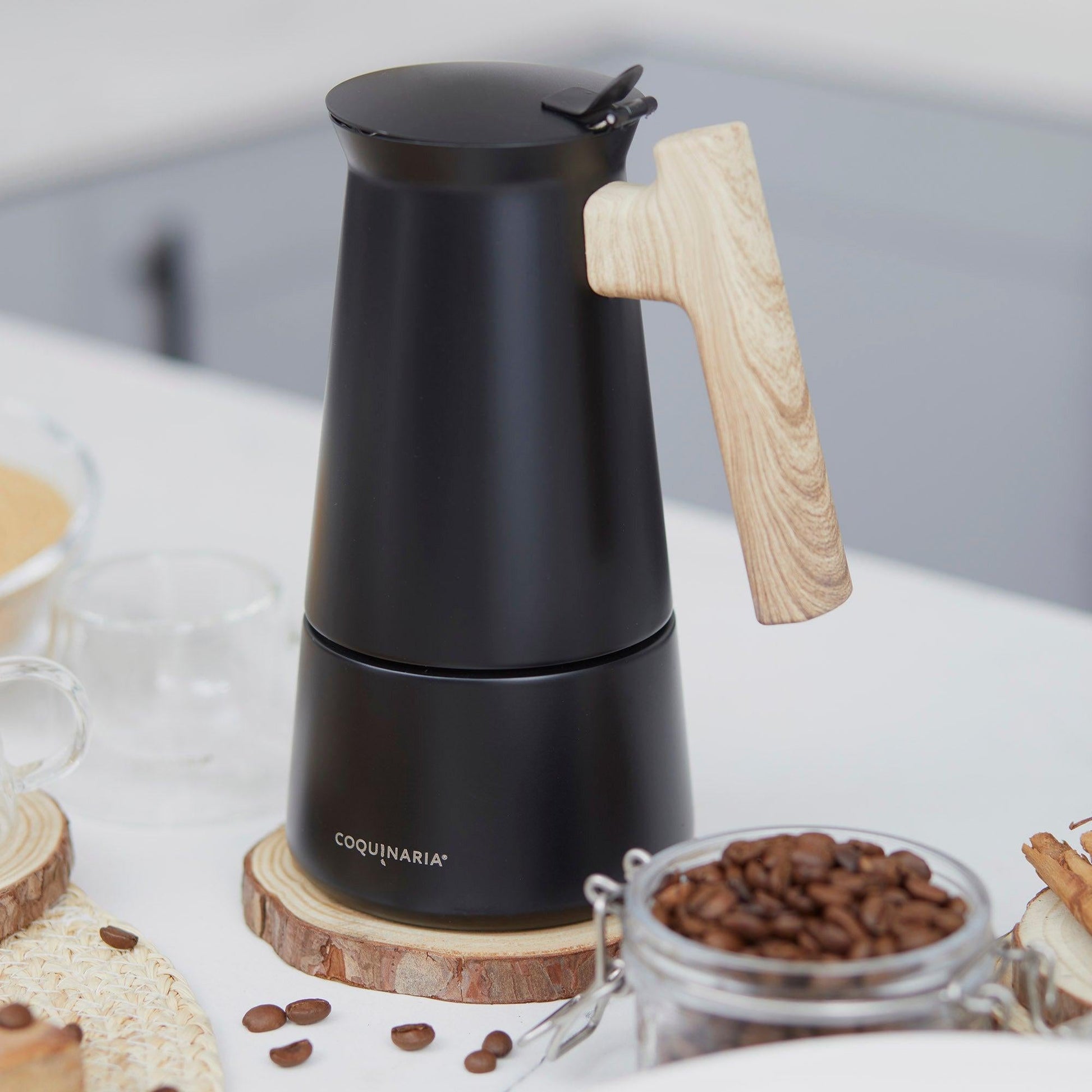 Eleva tu experiencia cafetera con esta elegante Cafetera Italiana 6 Tazas Coquinaria, diseñada para los verdaderos amantes del café. Su sofisticado acabado en negro mate complementado con cálidos detalles en madera aporta un toque distintivo y contemporáneo a cualquier cocina.