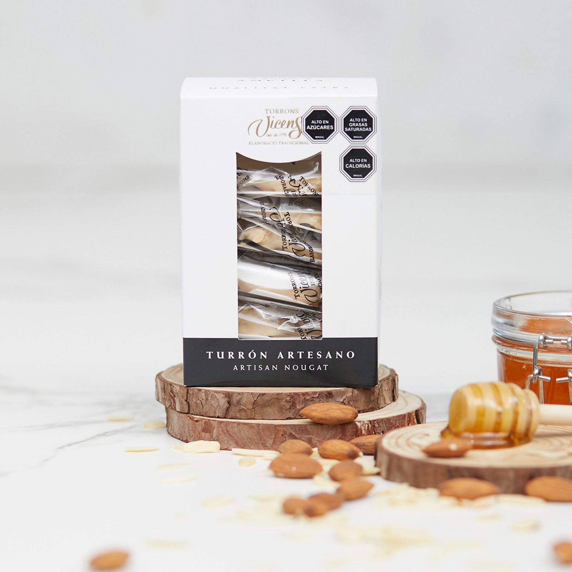 Caja Mini Turrones Artesanos Agramunt de Almendra 150g - Vicens. Descubre un pequeño lujo que celebra siglos de tradición artesanal. Cada pieza de estos mini turrones es una obra maestra, donde la suavidad dorada de la miel pura se entrelaza con la intensidad tostada de las almendras selectas. Envuelto en la delicadeza de una oblea blanca, este turrón invita a una experiencia sensorial única.