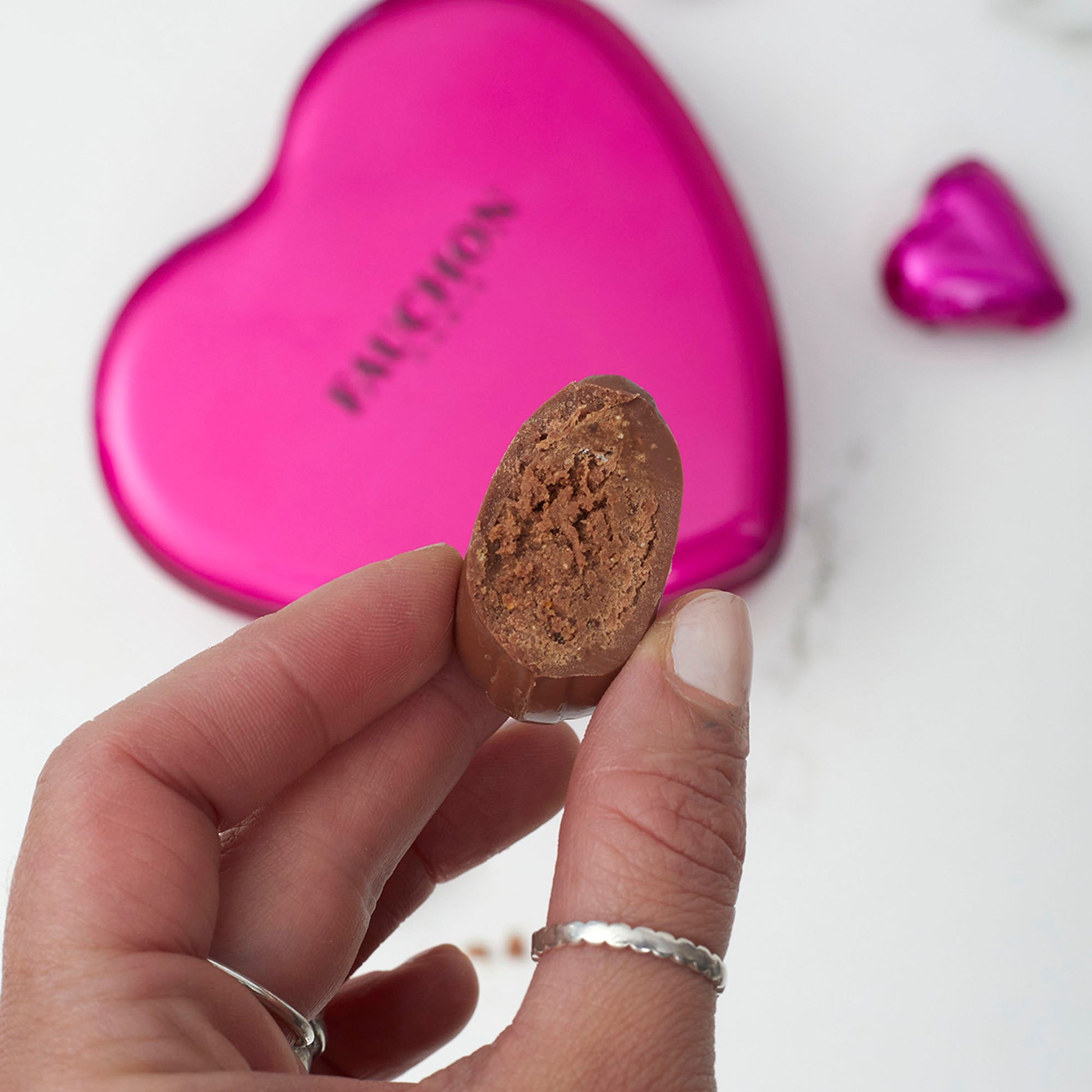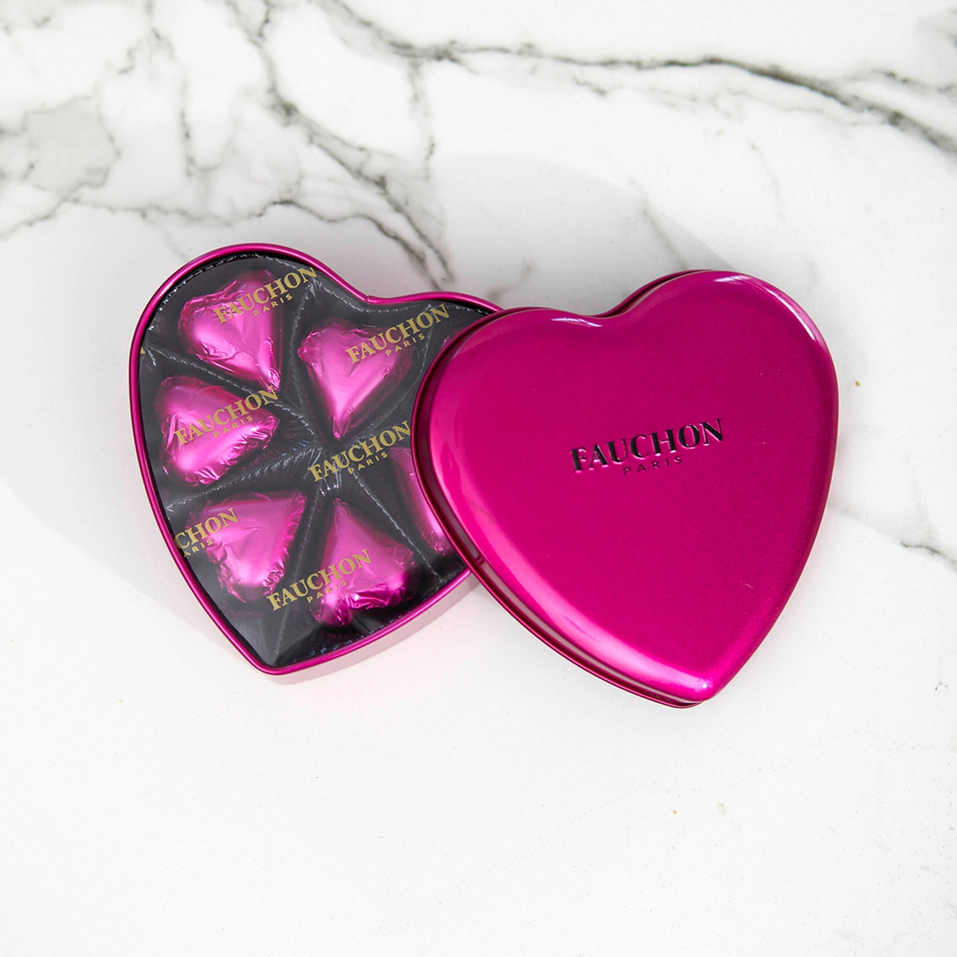 Una expresión de elegancia y dulzura en cada detalle. La icónica caja corazón magenta de Fauchon resguarda en su interior siete exquisitos corazones de chocolate con leche, rellenos de un sedoso praliné de avellanas del Piamonte, reconocidas por su calidad y sabor inigualable.