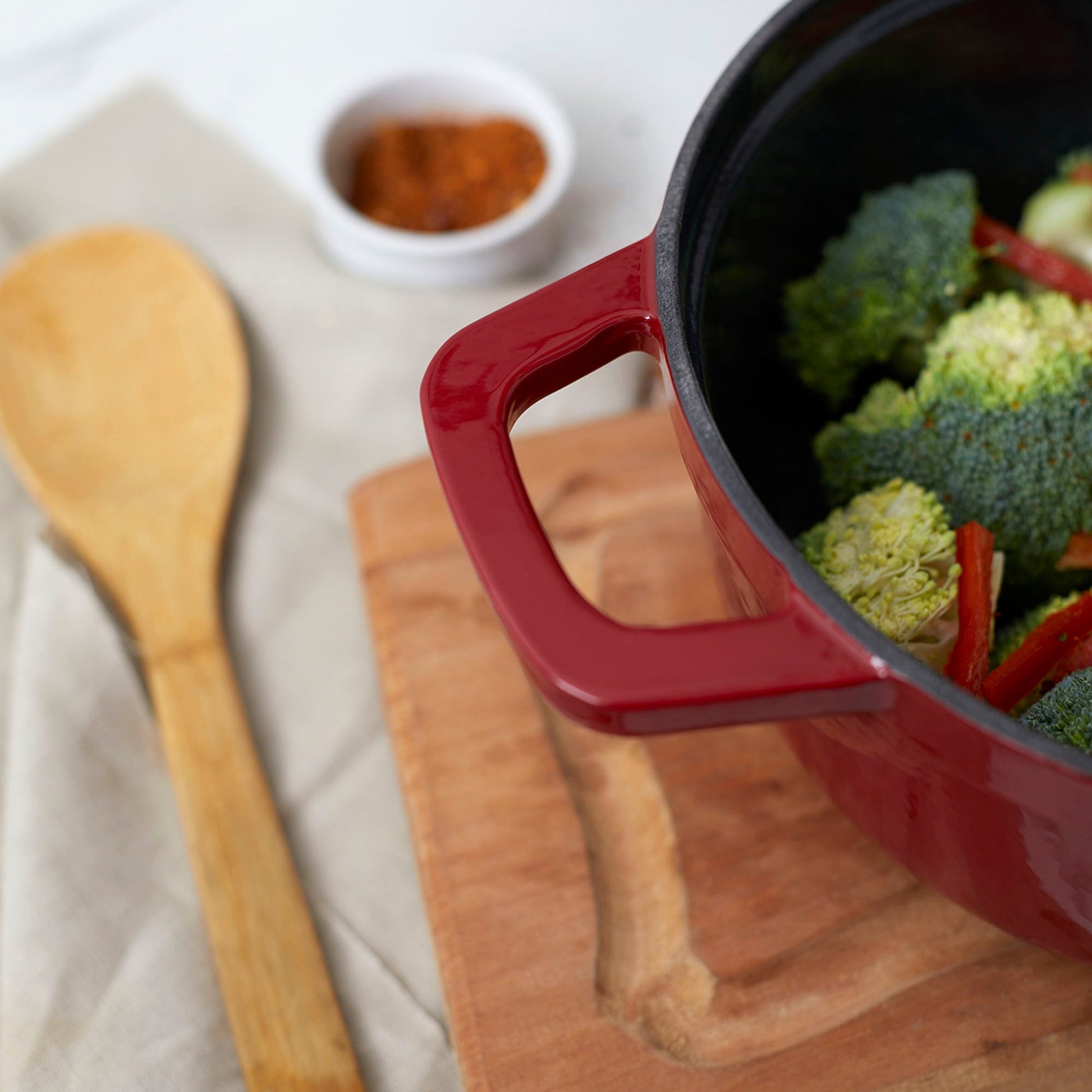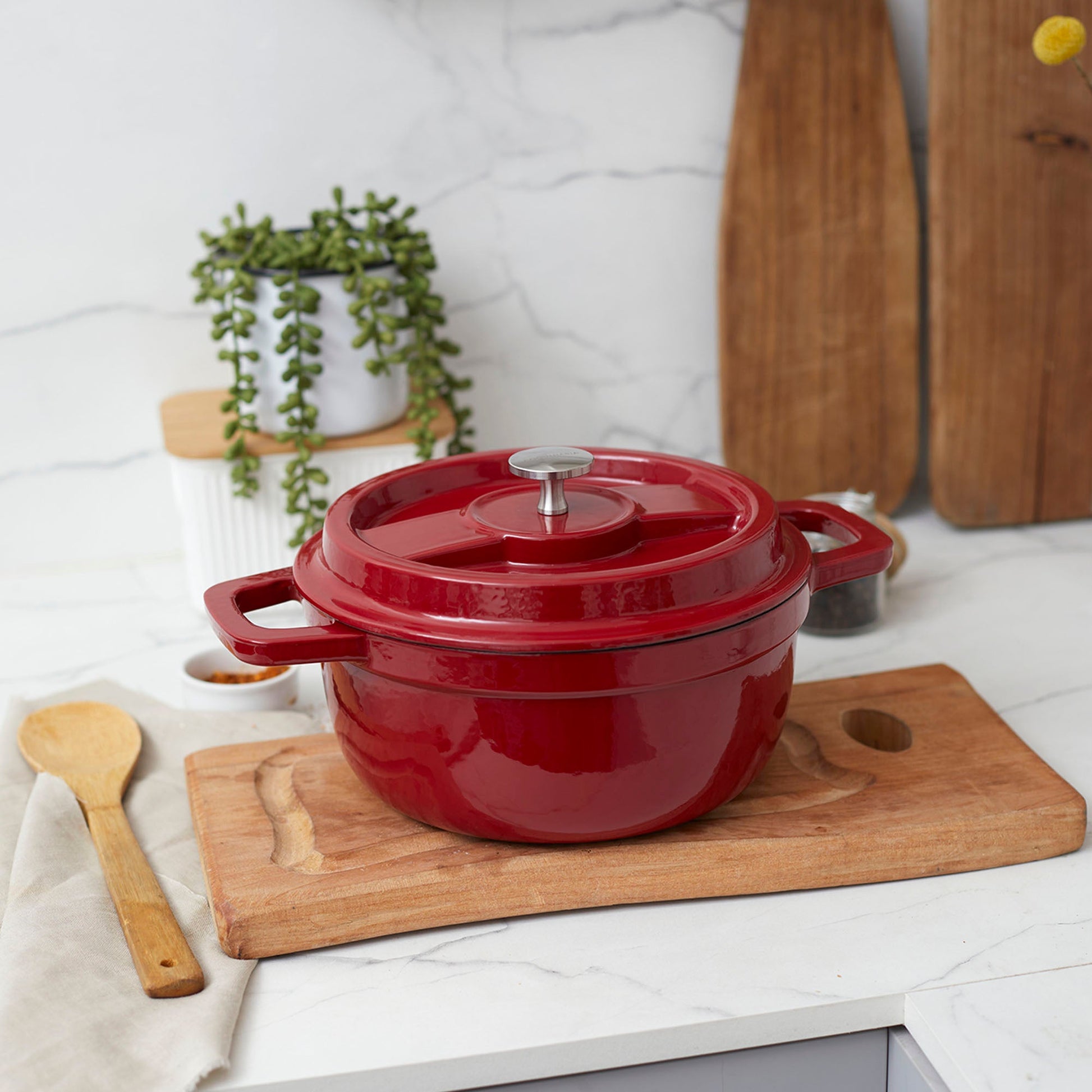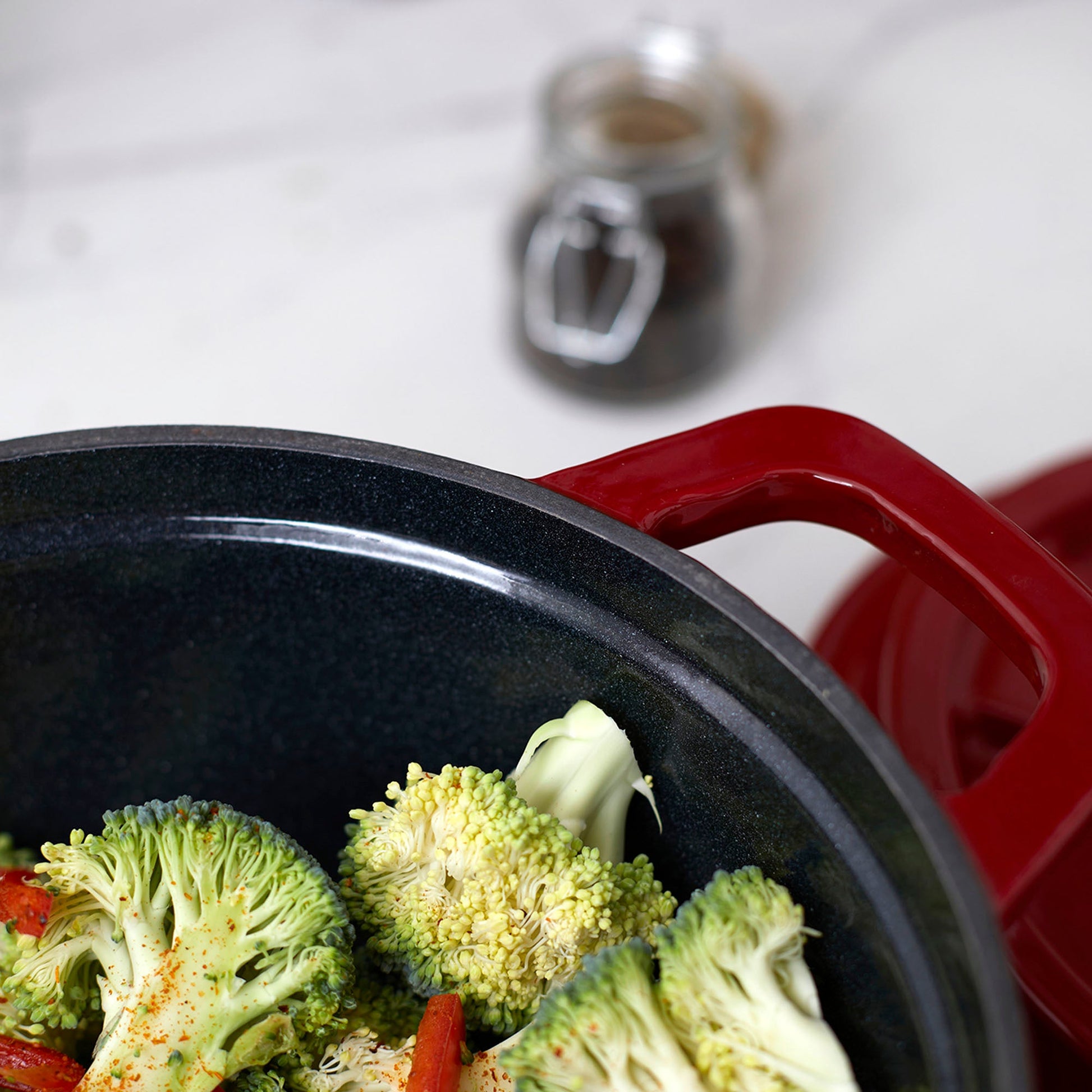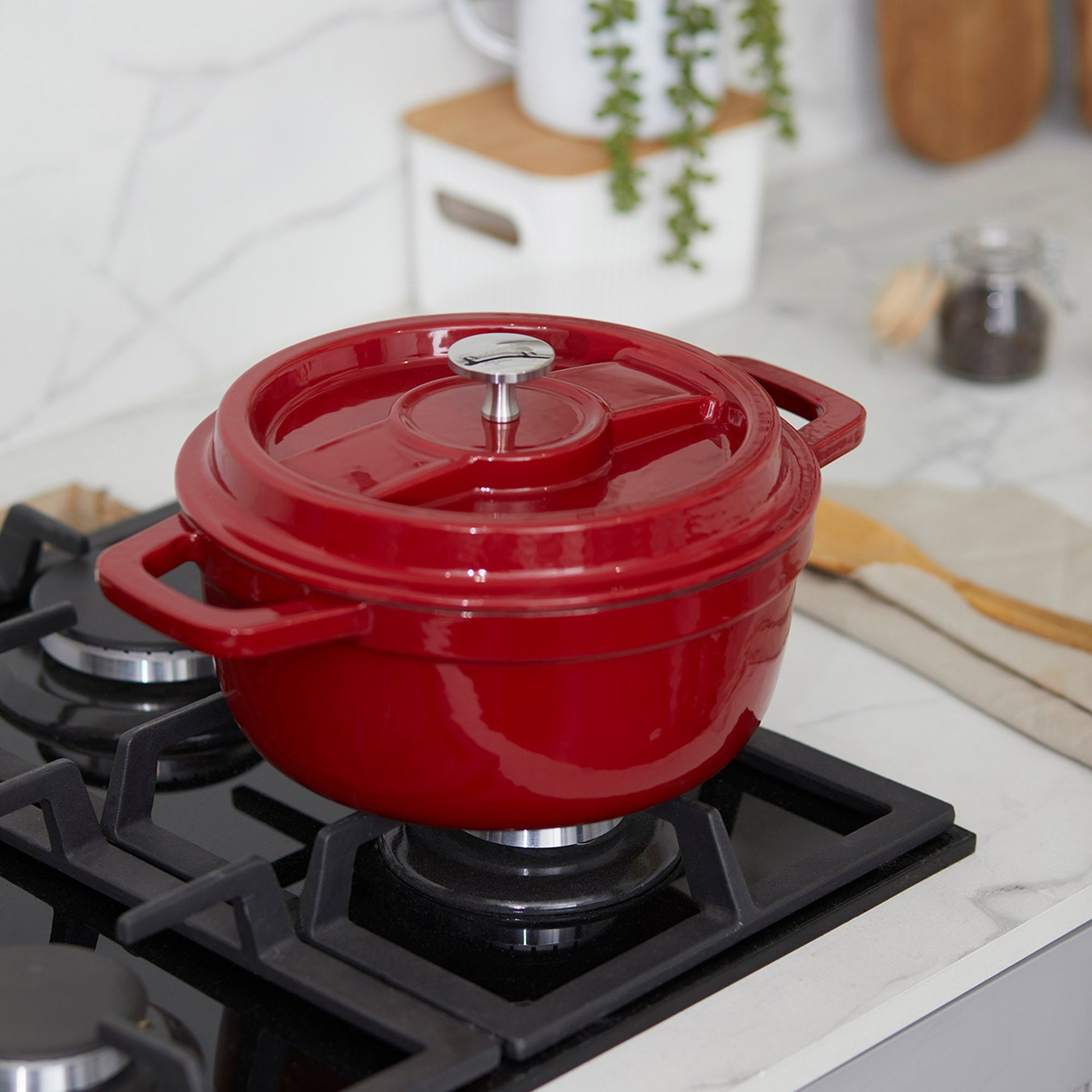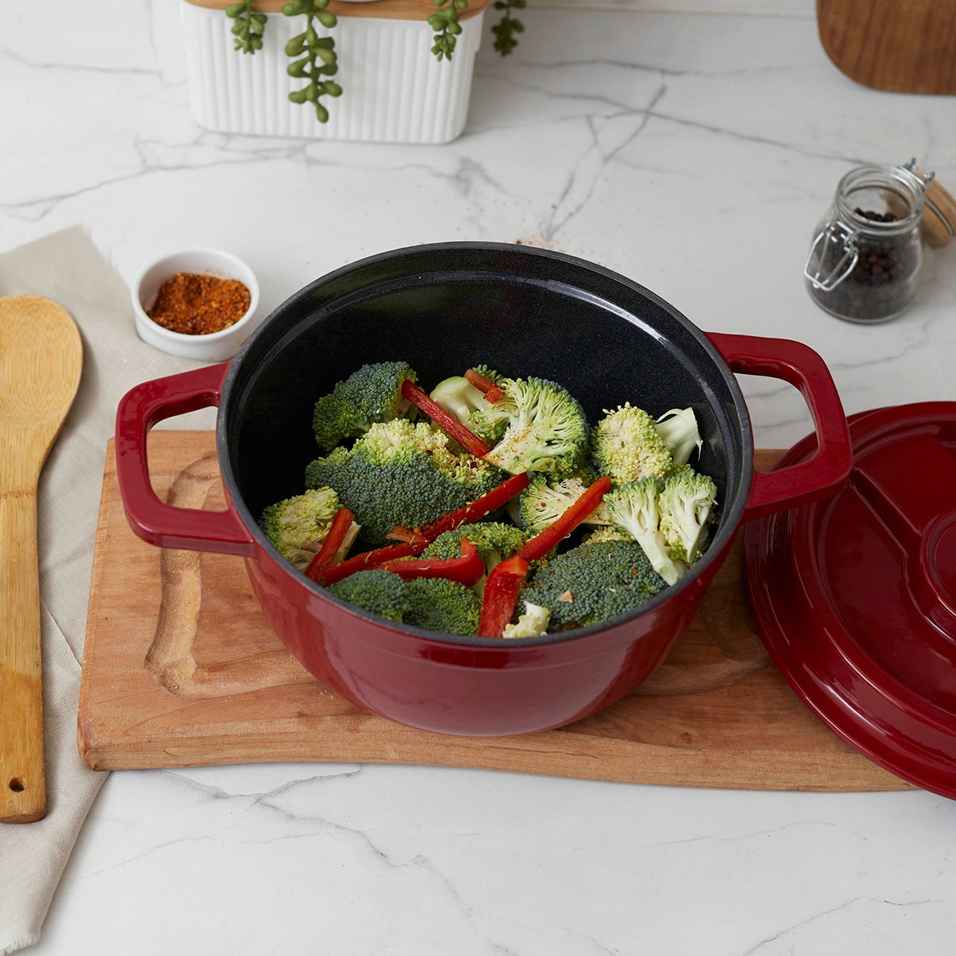 Descubre el arte de la cocina con la Olla de Hierro Fundido 2.9 Litros Coquinaria. Su diseño redondo y robusto, garantiza una distribución uniforme del calor para cocciones perfectas, manteniendo los alimentos calientes por más tiempo. Su interior esmaltado negro preserva los sabores y facilita la limpieza, mientras que su exterior rojo aporta un toque de elegancia a tu cocina. Ideal para guisos, estofados y preparaciones a fuego lento, esta olla es una inversión duradera que realza el sabor y la textura de cada plato.