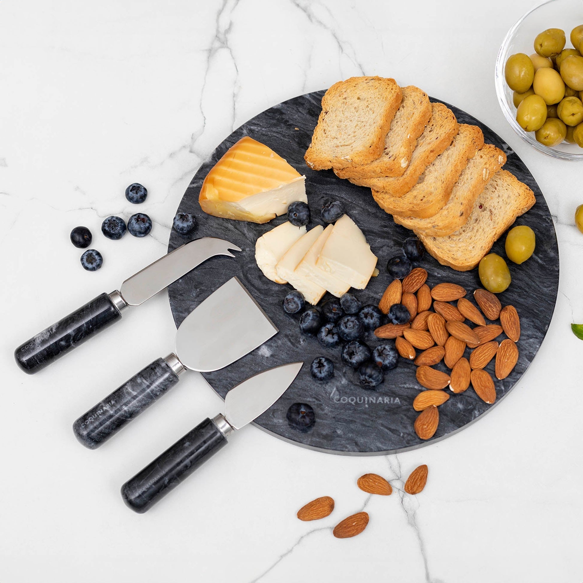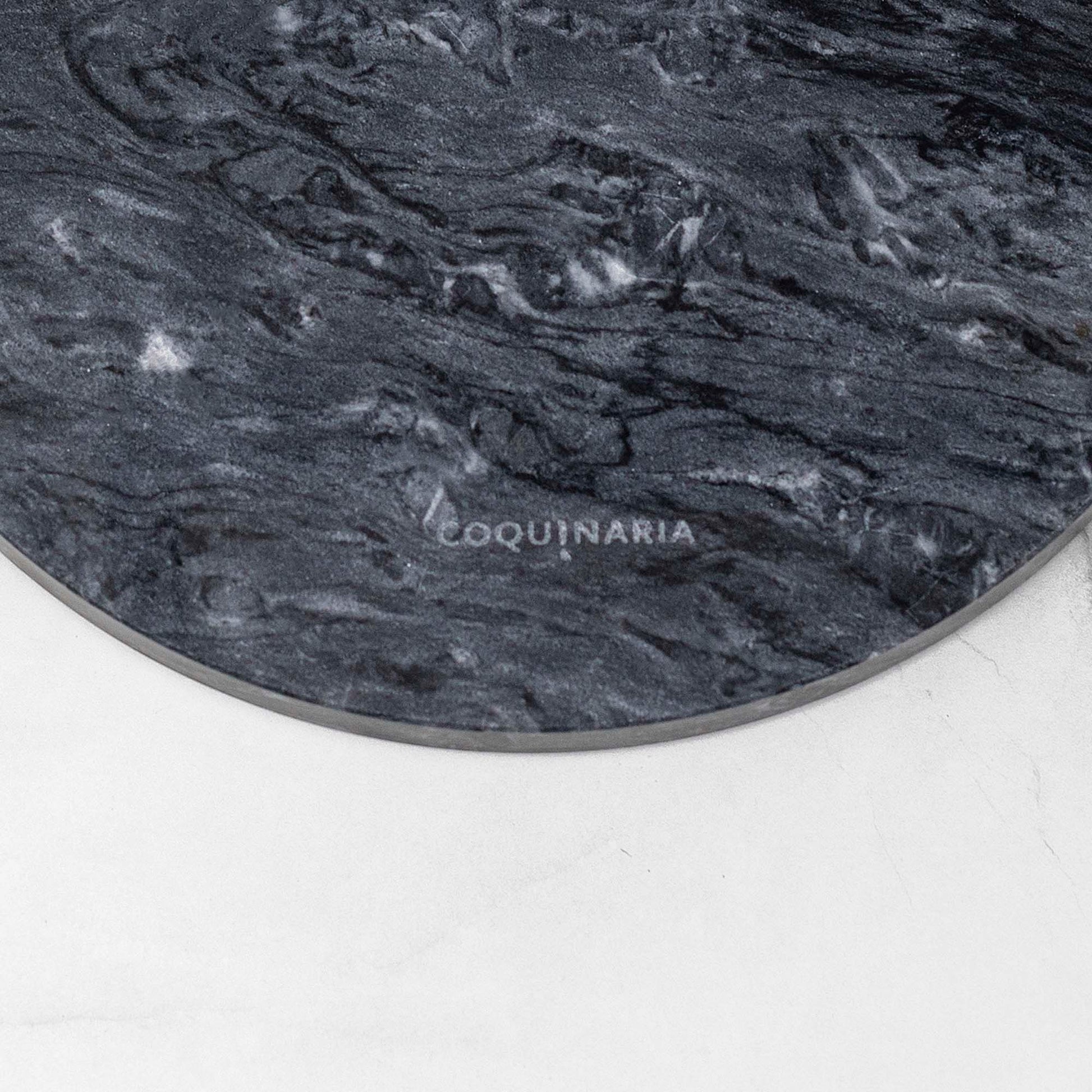 La tabla de mármol redonda color negro Coquinaria es perfecta para preparar y servir alimentos para tus aperitivos. Gracias a su superficie fría y no porosa, es ideal para a cortar ingredientes y presentar quesos, embutidos o postres. Además, su diseño elegante y duradero la convierte en una pieza decorativa versátil que complementa cualquier cocina o comedor, aportando un toque de sofisticación y funcionalidad. No incluye set de cuchillos.
