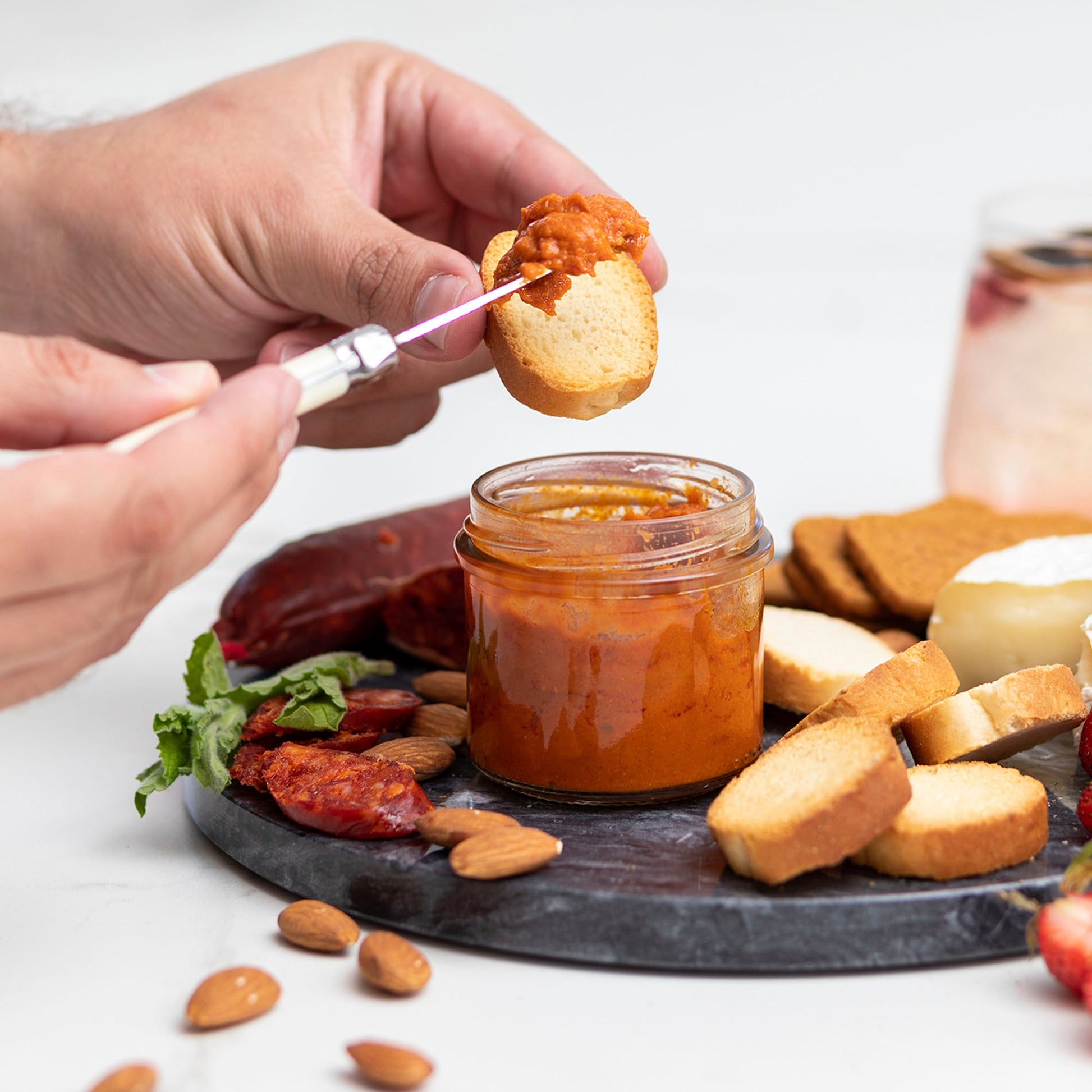 Una explosión de sabores mediterráneos. La Tartina de Pimiento Rojo y Queso Mascarpone de Fauchon es una crema artesanal que celebra la frescura y riqueza de ingredientes seleccionados con esmero. El equilibrio perfecto entre la suavidad del mascarpone, la intensidad del aceite de oliva, la acidez vibrante del pimiento y la frescura del tomate crea una experiencia cautivadora.